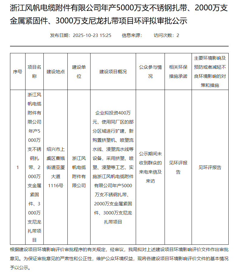 2025年10月23日,绍兴市生态环境局上虞分局就浙江风帆电缆附件有限公司年产5000万支不锈钢扎带、2000万支金属紧固件、3000万支尼龙扎带项目环评作出审批意见并对外进行公示,公示期:2025年10月23日至2025年10月30日。